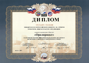 За достижение высокой эффективности результатов деятельности организации в современных экономических условиях Министерством регионального развития РФ ОАО «Орелпроект» было награждено дипломом 3-й степени победителя IX Всероссийского конкурса на лучшую проектную, изыскательскую организацию и фирму аналогичного профиля за 2012 год. В августе 2014 года Министерством регионального развития РФ ОАО «Орелпроект» было удостоено Диплома 3 степени победителя 10 всероссийского конкурса на лучшую проектную, изыскательскую организацию за 2013 г.